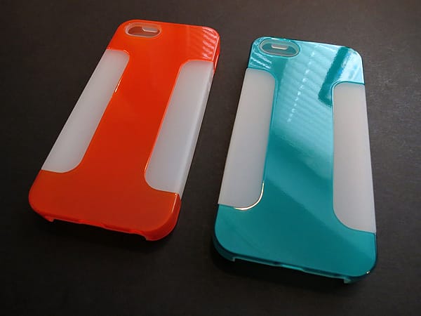 Setting the stage for a look other companies are very likely to follow, More Thing has chosen a rubber and hard plastic combination for one of its early iPhone 5 cases. Para Duo ($27) is composed of a cloudy white silicone case and an “I” shaped, orange, blue, purple, or red polycarbonate plastic frame that come together for protection and support. More Thing’s website lists a screen protector and cleaning cloth as pack-ins, although neither was included with our review samples, which shipped in nifty mirrored packages.