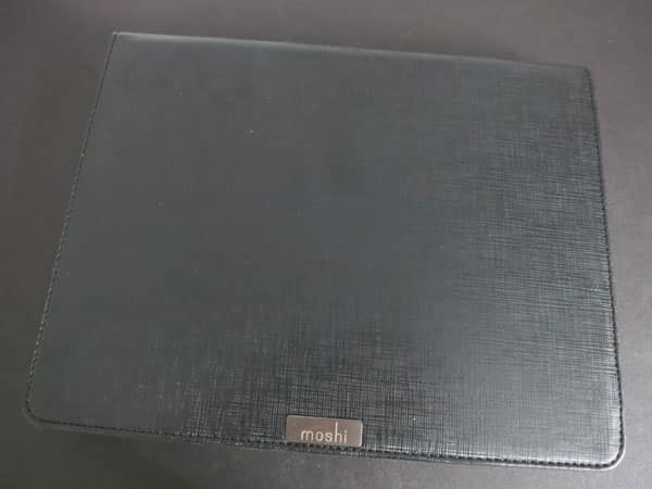 From the outside, Concerti looks like a lot of other folios, with no real signs that it has a flipped orientation. The exterior of the black model is covered with a linen-textured plastic; purple and grey versions with microfiber exteriors are also available. There’s an elastic band to hold the case shut, and a metal Moshi logo badge along the open edge.