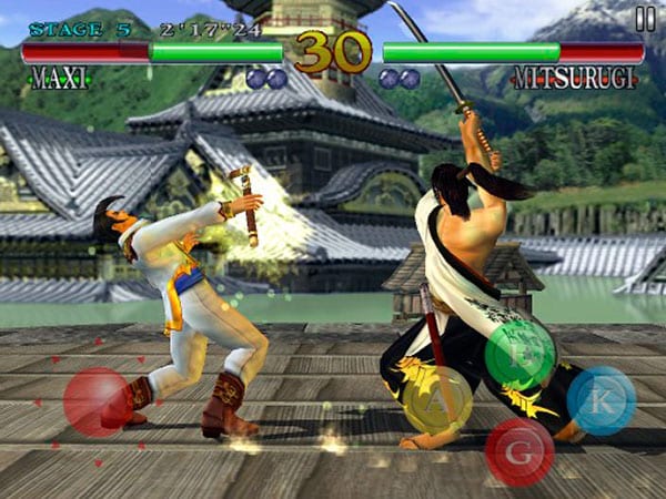 SoulCalibur falls way short in the graphics department relative to the Infinity Blade titles, but it’s so much better than most one-on-one fighting game rivals that it’s hard to complain too much. In keeping with the original game’s use of 3-D platforms with scant 3-D background elements overlaid atop flat 2-D scrolling backgrounds, the iOS version uses the same tricks to simulate 3-D environments; if you’re playing SoulCalibur on an iPad, you’ll notice the separations between 3-D and 2-D elements right away—arguably more than the upgrades that enable SoulCalibur’s polygons to enjoy higher resolutions than they originally did in arcades and the Dreamcast. While some of the special effects have been downgraded for iOS devices, they’re hardly noticeable.