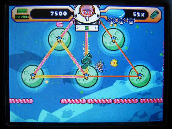 You begin to realize that there are different speeds that your character can be powered up to move at, only a few opportunities to bounce back onto a planet if you’ve missed its orbit and flown off into space, and that there’s a time limit in the form of a constantly-depleting oxygen tank to keep you moving fast. Some planets leech off your oxygen, others aren’t safe to touch, and so on; despite the simplicity of the “draw triangles to save characters” theme, Namco manages to make the levels fun and challenging as you progress.