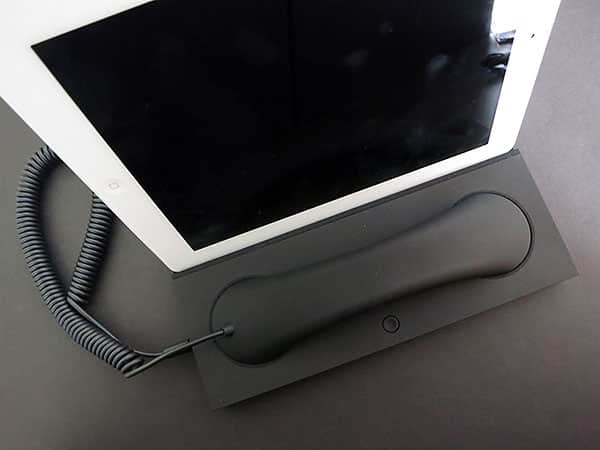 The three core parts of MM02t are very similar to those in MM02: a telephone handset connected with a coiled cable to a weighted desktop base. You can choose from soft touch black or glossy white finishes, each with benefits and consequences we’ve discussed in prior Native Union reviews, though both are attractive and contemporary. Conspicuously new in the MM02t is a large passive resting area for a portrait-orientation tablet, plus enough spare room to accommodate an iPhone or iPod touch; an iPad in landscape orientation also fits, leaving no room for a second device.