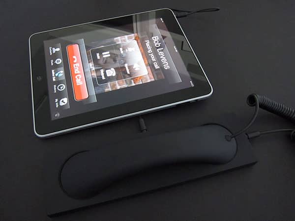 A rubber pad is included so you can set your iPod touch or iPhone down somewhere while it’s being used with the handset. You’ll need your device’s screen to dial numbers and do whatever else might be necessary to initiate conversations, apart from hitting that one handset button, and hanging up MM02’s phone doesn’t do anything other than placing the handset in the cradle.