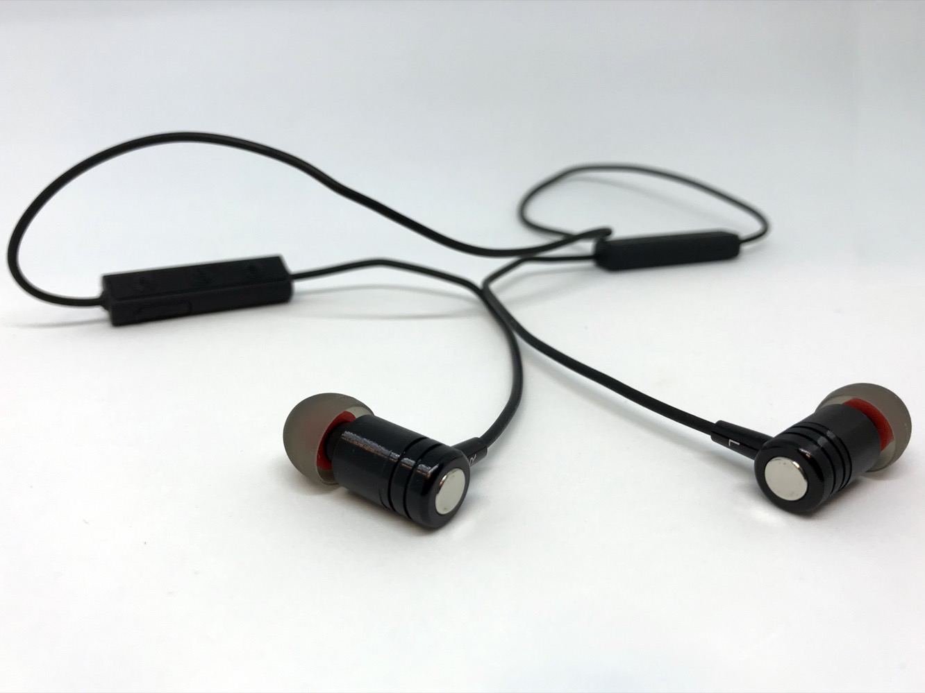 The Alloy comes with three sizes of ear tips, one set of flexible wings for a secure fit, a micro USB charging cable, and a storage case. The wings are thoughtfully designed, with cutouts to avoid blocking the bass ports on the underside of the driver housings. It paired easily with our iPhone, displaying battery life in the notification screen, and its three-button control pod worked in the familiar way. The Alloy’s got a trick up its sleeve — strong magnets on the back of the driver housings serve not only to hold the Alloy around the neck when not in use, but will also pause music and put the Alloy into a low-power mode to save battery life. We have no complaints about the Alloy’s call quality, battery life, or range — all were on par with Naztech’s promises.