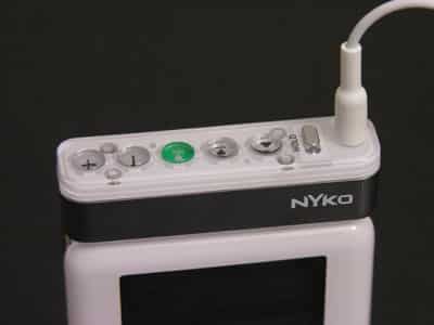 Like the bottom four-fifths of the iTop’s body, the Hold switch is chromed, matching the rear casings of full-sized iPods, and the top surface is mostly thick clear acrylic with just enough white to mimic larger iPods’ front bodies. Nyko’s logo appears in white on iTop’s front face. A groove in its bottom is cut to accommodate the original Hold switch positions of full-sized iPods, and both a headphone plug and extended four-pin connector are used to connect to the iPod. Consequently, iTop locks firmly into place on an iPod’s top surface – even an iPod mini’s – and doesn’t twist or shake unless you pull it out.