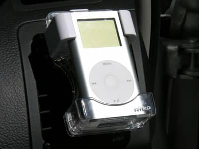 Pros: A highly affordable iPod car mount that lives up to its universal name; properly holds full-sized and mini iPods in well-designed cradle, mounts on varying vehicles with adjustable clips or adhesive, both of which are included. Compatible with car chargers, as well.