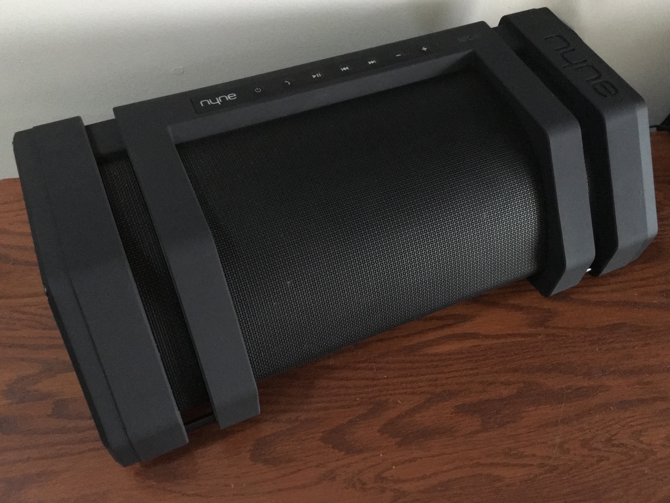 Nyne’s new Rock ($250) is a massive, portable Bluetooth 4.0 speaker — its size will divide prospective consumers from the get-go. Boasting 65W of total power, Rock packs two midrange drivers, two tweeters, and a subwoofer into its large, rugged, black frame. Rock has a speakerphone, and offers some water protection as well, claiming a rating of IPX3. Nyne claims the speaker can get up to 8-10 hours of playtime on a full charge, and an included USB port on the speaker can charge an iOS device at 1A speed. Rock ships with an AC adapter for recharging its battery, and an audio cable. Nyne calls Rock “The Booming Beast,” and we soon found out why.