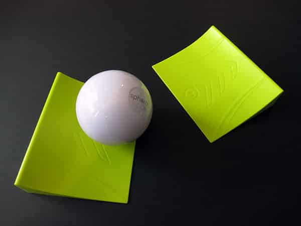 Regardless of the bundle you consider purchasing, you’ll find that Orbotix has improved Sphero 2.0’s packaging and pack-ins. The new version arrives in a largely black box that uses a handsome mix of glossy and matte textures, with strong visual contrasts coming from white and colored images on each side. Made from thick cardboard that separates into two overlapping pieces, the box feels like something Apple could have developed, holding two large green plastic ramps inside with a matching plastic tray to hold the Sphero ball. Also inside the package are a blue inductive charging tray and wall power adapter to refuel Sphero, largely the same as ones previously shipped by Orbotix. While the base model’s $130 price hasn’t changed, the included ramps and premium packaging are two of three factors that make this model feel like a better value than its predecessor.