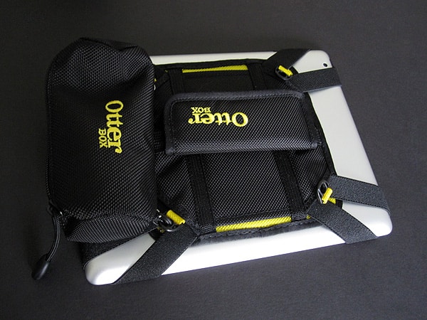 The main component of Utility Series Latch is a square harness with four elastic loops that fit around the corners of the tablet, either bare or in one of OtterBox’s Defender Series or Commuter Series cases. It’s made out of nylon and the quality is nice, but there are so many straps and loops that it looks messy, and it doesn’t do much to protect the iPad inside. At the base of each of the cover’s loops is a plastic ring for attaching some of the other included pieces, such as a small bag or strap.