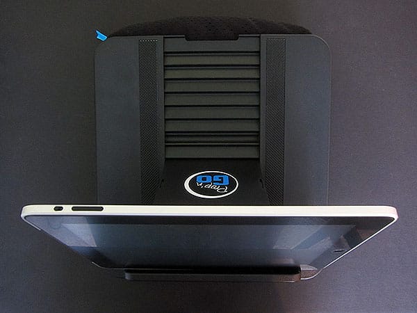 Prop ‘n Go takes a very different approach to holding a tablet in place. Rather than including an integrated iPad 2 holder, it uses a series of 14 ridges in the plastic base to keep either an iPad or iPad 2 standing up at a variety of angles between 9° and 75°. A bi-fold plastic stand provides sturdy backing, and textured rubber strips along either side combined with a lip at the bottom keep the device in place. This provides a few benefits: your tablet doesn’t need to be removed from its case before using the stand, and other devices beyond just a single iPad model can be used as well. Unfortunately, Padded Spaces has run into problems a few times now with the non-slip strips. The original ones shipped with the Prop ‘n Go peeled off, and so did the first round of replacements. According to the company’s blog, it has found a much more suitable replacement and will be shipping them out to customers in the near future. This is a major downer for an otherwise decent product.