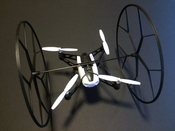 Measuring roughly 5” by 5” in its most basic form, the nearly palm-sized Rolling Spider looks like a baby compared with the AR.Drones. Available in three different body colors, it has a Terminator-like front “face” including bi-colored “eye” status lights, and includes a collection of different stickers to give it a “mouth.” Used in the basic mode, Rolling Spider is a tiny copter. It can fly at roughly 66-foot distances from any iOS device equipped with Bluetooth 4, using a pressure sensor, gyroscope, and accelerometer to keep aloft and as stable as wind conditions permit. Optionally, a new Free Fall mode allows it to take off immediately after it detects that you’ve dropped it.