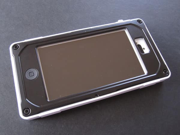The 5.5” by 2.75” plastic and aluminum box is the kind of case that requires a complicated installation process. Of the three separate layers of the case, the rear tray is the largest: it’s lined with shock-absorbent rubber around the edges and back, thick enough so that the iPhone 5 is held firmly in place when inserted, and deep enough the the device is fully recessed. Next goes the aluminum bezel frame, coupled with the non-adhesive screen protector. The latter has small tabs that attach to the former, holding together well enough that they can be installed as one piece.
