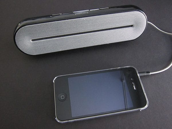 Recently released outside the United States as a Philips and DLO combined offering, the SBA3000 Baton Portable Speaker ($50) is a pill-shaped two-driver audio system powered by four AA batteries — not included — and shielded for compatibility with iPhones, iPods, and iPads alike.