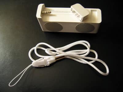 You pop the battery into the speaker box’s bottom, cover it with the panel, insert your powered-on shuffle into the cap and cap into the box, then flip the unit’s flat, bottom-mounted on-off switch to on. A shuffle-like yellow light appears in-between the two speakers to let you know the power’s on. Attach the lanyard if you want to wear it on your neck, or leave it off if you don’t.