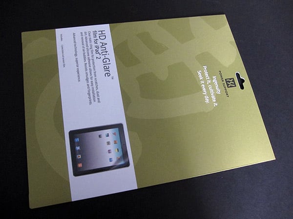 As the sequel to last year’s Anti-Glare Film for iPad, Power Support’s new HD Anti-Glare Film for iPad 2 ($35) has jumped $10 in price from the prior version without gaining any pack-ins or other frills — the cardboard shipping sleeve contains only a single sheet of film, and instructions on how to install it.