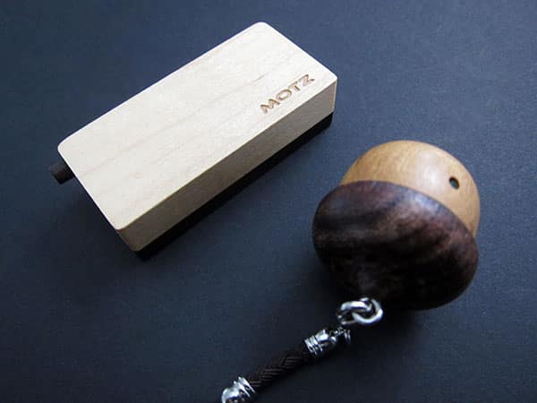 If it wasn’t for the fact that there have been a few interesting and occasionally successful wooden iPod and iPhone cases over the years, we’d be completely scratching our heads over the potential appeal of the following two accessories to Apple fans. Pyramid Distribution has imported two miniature speakers from a Korean company called Motz, one called Tiny Wooden Acorn ($46) and the other called Tiny Wooden Emotion ($46). They are, respectively, a rechargeable battery-powered auxiliary speaker and FM radio tuner in the shape of a 1.5-inch-tall acorn, or the same general components housed within a 2.4-inch-long box, both made from carved apricots. As crazy as they might look, these little speakers pack surprisingly robust sound, and only have a couple of issues that may limit their appeal to the niche they’re intended to reach.