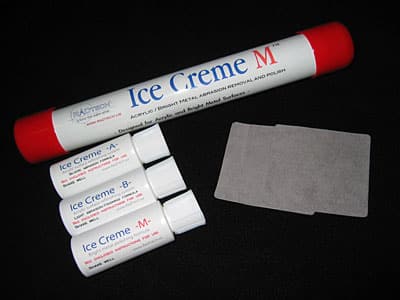 RadTech sent a total of three polishes: Ice Creme A and Ice Creme B are one-ounce bottles of thick, creamy fluids used in tandem to restore plastic surfaces. Ice Creme M is also a one-ounce bottle of cream, but is used solely on an iPod’s metal back surface. The full Ice Creme set includes all three creams, four small square polishing cloths, and a single page of instructions, all packaged inside a cool plastic shipping tube.
