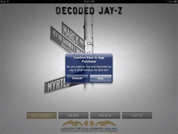To Jay-Z’s and Random House Digital’s credit, the app does include plenty of quality material, and fans will benefit from reading and listening to Decoded. The full $35 application includes 19 total videos, along with a suggestion that at least one more song—Brooklyn’s Finest, Izzo (H.O.V.A.), Lost One, Young Gz, or I Know—will be decoded in the future based on a user vote from within the app; it’s presumable but not explicit in any way within the app that the additional content will be a free update rather than another in-app purchase. Additionally, though your decoding choices are registered to the device, such that uninstalling and reinstalling the app merely decodes the same tracks again, each installation of the app on a different device enables you to decode whichever 10 tracks you desire. This “trick” owners of four iOS devices to conceivably see all of the content by using multiple installations of the $10 app, an inconvenience that some users might put themselves through to save some money.