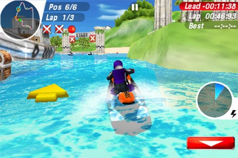 Though Aqua Moto 2 includes 48 courses by Resolution’s count—and lots of courses are appreciated, even if they reuse the same general background art—the ramp-up in difficulty is very uneven. An island resort’s gentle, semi-twisting paths quickly give way to super-aggressive turns when you move on to the first of the Grecian courses, settling considerably before you move on to levels in Egypt. Some of the turns in Greece are so sharp that levels feel really hard to master, becoming manageable only when you get the right steering and vehicle combination; floating red and white dividers in the water are more confusing than helpful in steering you towards your next goal, and you pass right through them rather than bumping into them.