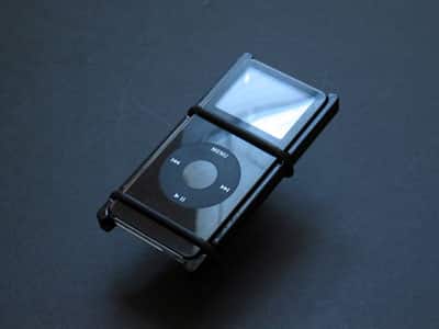 Available in six colors, this machined metal cradle attaches to your iPod nano using thick rubber bands, and then to the handlebars of your bicycle with a sturdy, adjustable metal grip.