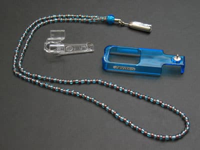 Simple clips for the iPod shuffle are now in abundance; we’ve reviewed nearly too many to count. Now Rivet has added its own spin to the pile with Grab for iPod shuffle ($20), a clear plastic pocket clip and a colored plastic lanyard clip with a beaded necklace. The company sells clear, blue, pink, and graphite versions of the lanyard clip, blue and pink versions of the beaded necklace, and cloth necklaces in graphite and gray, the latter of which we did not receive for review.