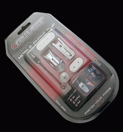 Rivet, maker of teenager-friendly universal mobile phone clips, provided us with samples of three of their clip packages: “Powerbroker,” “Super Treker,” and “Kingpin,” each of which contains accessories for carrying portable devices. Powerbroker includes a set of backpack, belt and car mounting clips, Super Treker a belt hook clip, and Kingpin a stylish reptilian chain with clasp.
