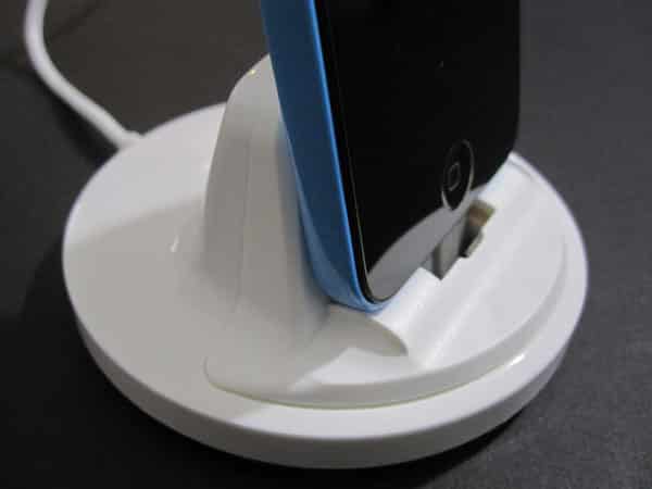 Sync & Charge Dock is a plastic disc just under four inches in diameter, available in black or white. Right in the middle, the plastic is molded to rise up and form a rear support for your iPhone or iPod touch. Directly in front of that is the Lightning plug, surrounded by gray plastic. It moves back and forth, from a resting position of 75°, forward to 105°. Also included is a removable insert, designed to be left on when no case is being used, and taken off when one is. Unlike the rest of the plastic, which is glossy, this piece has a matte finish.