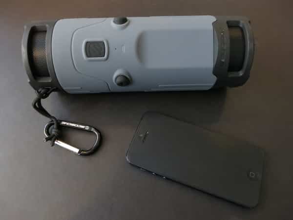 Packed with two 40mm speakers and a 10-hour rechargeable battery, boomBottle is a rubber-coated, IPX4-certified splashproof tube designed to be used for music and speakerphone calls indoors or outdoors. Eight inches tall with a roughly 2.7” diameter, boomBottle can fit snugly into cupholders and water bottle cages with ease, or attach with an included caribiner clip to a bag or belt. Having won one of our 2013 CES Best of Show Finalist Awards, it has a somewhat distinctive form factor that’s set apart from other tube-shaped speakers by color options, rubber exterior molding, and separate 360-degree speaker cones inside its edges. Its only controls are volume and power buttons, while a splashproof rubber cap protects the rear charging port and aux-in port. Without a doubt, boomBottle is the most solid-feeling of this bunch. It’s the only one that actually feels like a “take it anywhere without fear” speaker, which helps to justify its higher price tag. It includes a charging cable, but not the travel pouch we originally saw it with