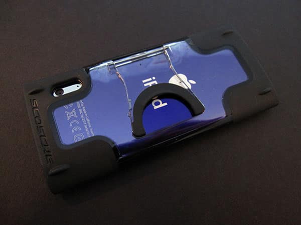 Relatively simple in design, Scosche’s new KickBack n5 case for the iPod nano 5G ($25) consists of a combined rubber and clear plastic shell with a flip-out rear stand and a hole for the nano’s camera.