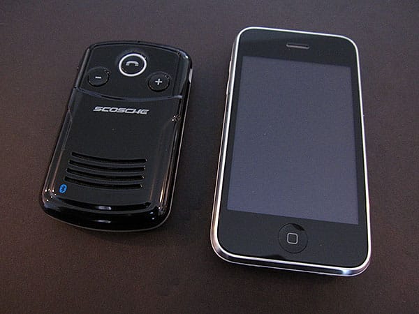 That turns out to be solChat 2’s only noteworthy weakness, and its strengths generally more than make up for it, particularly its integrated voice functionality. Scosche’s design starts by including clear English voice prompting, enabling the unit to speak to you to let you know that it’s pairing or disconnecting, rather than the beeps found in other units. A press of its call button activates the iPhone 3GS’s Voice Control feature, enabling users of iPhone OS 3.1 or later to speak into solChat’s microphone to dial callers. Other than learning the proper length of button-pressing time on solChat to activate this feature—a brief press, not long enough to turn off the unit—Voice Control and other features of the unit are extremely easy to use. Twin volume buttons are also located on its surface, with a mic close to your side of the device and speaker vents at the other end.