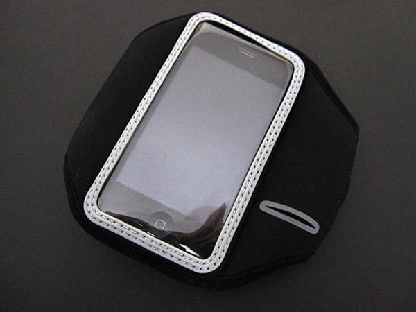 Generic in design, this black neoprene armband with reflective gray strips is called SoundKase Sport Case ($25). It’s made to fit the iPhone, iPhone 3G, and iPod touch, with a clear screen protector on the front and holes for each device’s headphone port on the back.
