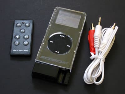Based largely upon ABT’s previously released and reviewed iJet for iPod nano, Scosche’s Wireless RF Remote for iPod nano strips out the former product’s integrated FM transmitter, preserving its wireless RF remote control (here with 7 buttons and Scosche labelling), plastic black and clear iPod case, and packed-in stereo audio cable.