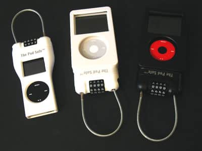 Pros: A reinforced plastic security system for either 4G and 5G iPods or iPod nanos, combining a comparatively secure four-digit combination lock with a strong steel cable and a full iPod case. Provides complete access to iPod’s screen and controls while in use, available in white and black versions.