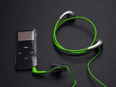 Pros: Lightweight sport headphones that are like Apple’s packed-in iPod earbuds, but with a loop-like flexible connecting cord between them, water- and sweat-resistance, greater durability, and bright, sporty green coloration. Very good audio quality, with strong extended bass. Good carrying case is included, along with shirt clip and replacement earbud covers in foam and rubber.