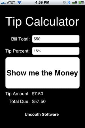 Its black and white one-screen interface offers fields for entry of the bill total and tip percentage; hitting a large “show me the money” button calculates the tip amount and grand total, which appear below the button. Unfortunately, that’s it: there are no check splitting features, no way to add tax, and no frills on the interface, which is quite amateurish.