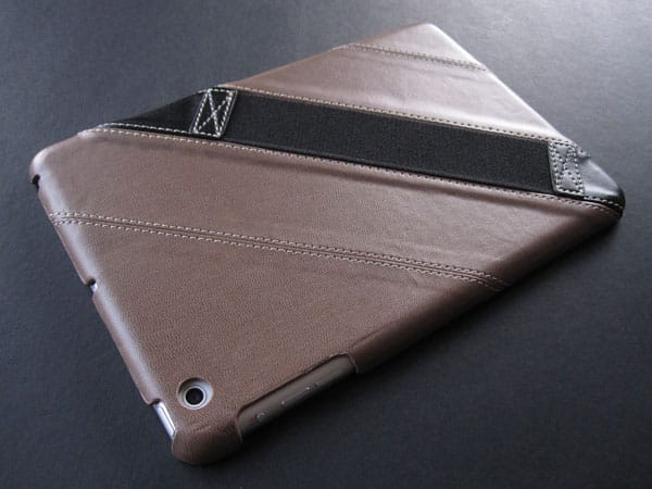 Despite the fact that the material is obviously faux leather, Simplism went with a very nice design for the back of this case. Stitching runs diagonally across the back, providing a classy touch. Starting at the bottom left corner and ending about an inch short of the top right edge is the elastic hand strap. The black band rests flat when not in use, but is easy to pick up and slide across your left hand for portrait iPad use, or on your right hand for landscape use.