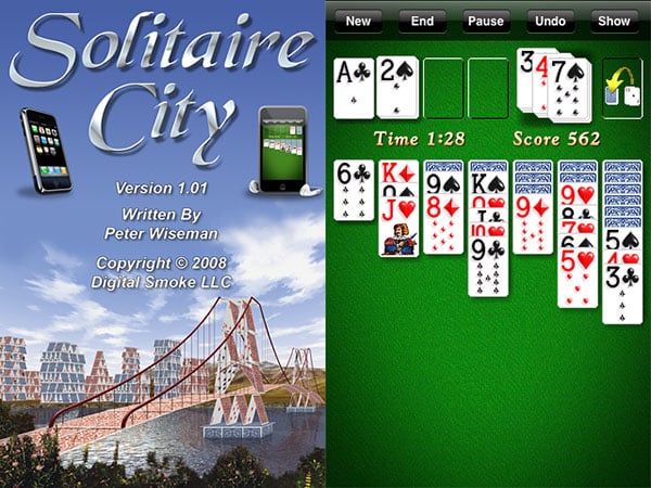 Another of the actually impressive titles in this collection is Solitaire City™ ($10) by Digital Smoke, though what’s good here is more under the hood than on the surface. Unlike most of the other games in this roundup, Solitaire City actually includes an online leaderboard, as well as in-game tracking of your best performances, preventing you from putting scores online unless they’ve been achieved under strict competition timing conditions. As Digital Smoke realized that online score tracking can consume a lot of data when you’re on the cellular network, the online leaderboard is now opt-in; in other words, it can be turned on or off.