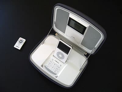 Now there’s i-F3 ($180), and once again, Sonic Impact has kept the basic formula the same while adding a couple of new twists at a $30 premium. You still get a hard, zippered, included hand strap-optional case with four speaker drivers inside, alongside an iPod dock, a 15-hour rechargeable Lithium-Ion battery, and an Infrared remote control. Interestingly, the color has shifted back to the gray ballistic nylon exterior and mostly white interior of i-Fusion. And there’s still a full-sized iPod (not iPhone)-sized storage compartment between the speakers, and a remote-sized compartment next to the dock, so you can pack everything up for easy carrying on the road. Fully new are a digital alarm clock and an FM radio, which Sonic Impact has sandwiched into the old design.