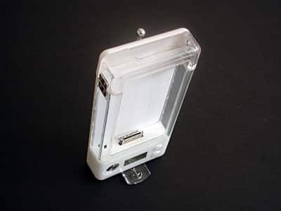 Sonnet’s Podfreq is in a different size category altogether. Best described as an iPod enclosure, the mostly plastic casing surrounds the top, bottom, back and sides of the iPod, sealing shut with a metal hinge. A hole in the case’s top permits hold switch and headphone port access; there is no protection for the iPod’s screen or controls. Two soft spacer pads adjust the compartment’s hold on different-sized 3G iPods.
