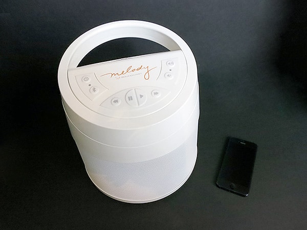 Almost entirely white with gray and orange accents, Melody looks somewhat like a home ice cream maker, but feels more solid thanks to a nine-pound weight and a sturdy circular perforated metal grille that wraps around the unit’s base. It’s a more practical design than before, losing only one obvious feature from OutCast: a bottom ambient light has been removed. Soundcast included this feature because OutCast was meant to stand on its own like a pillar next to tables and chairs, potentially outdoors in the dark; Melody’s small enough that it will typically be placed atop a table, though it could be left on the ground if necessary.