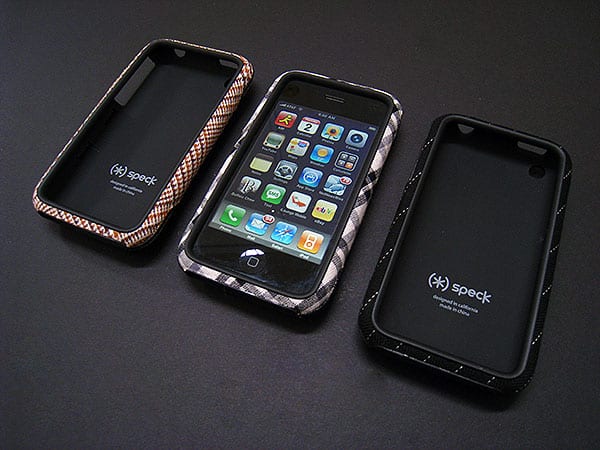 Then there’s Speck’s Fitted Case. It also splits in two halves, but here in front and back pieces rather than top and bottom ones. It leaves the same parts of the iPhone 3G exposed, and offers the same degree of accessory compatibility—it works with oversized headphone plugs, Universal Docks, and everything else—except for the iPhone 3G Dock. If you’re using that one accessory, you’ll have an issue; otherwise, you won’t.