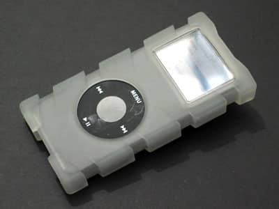 Pros: Resilient soft plastic iPod 5G and nano cases with edgy, tough design that resembles – especially in black color – a tire tread. Each case includes a good hard plastic screen protector, frosted detachable belt clip, and matchin detachable belt clip nub. 5G version protects virtually every part of the 5G iPod properly, save its front Click Wheel, while allowing use of almost all headphones and cabled Dock Connecting accessories. Rubber spacer inside 5G version softly enables case to fit 30GB and 60GB iPods.