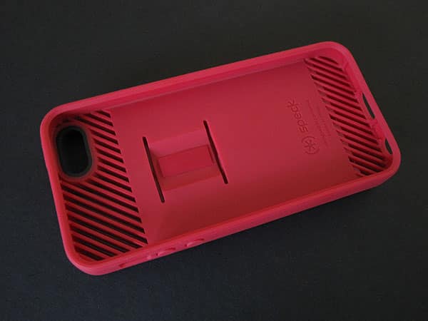 Rather than combining plastic and rubber like its predecessor CandyShell Card, SmartFlex Card’s entire body is made of smooth, semi-flexible rubber that feels quite nice. This makes inserting and removing an iPhone 5 very easy, while insuring that phone is held strongly inside. Like every case we’ve seen from Speck for the current-generation iPhone, Card almost fully covers the device’s edges, including its Sleep/Wake and volume buttons, as well as protecting the display with a raised lip. Unfortunately, the former button loses pretty much all tactility, which is a letdown.