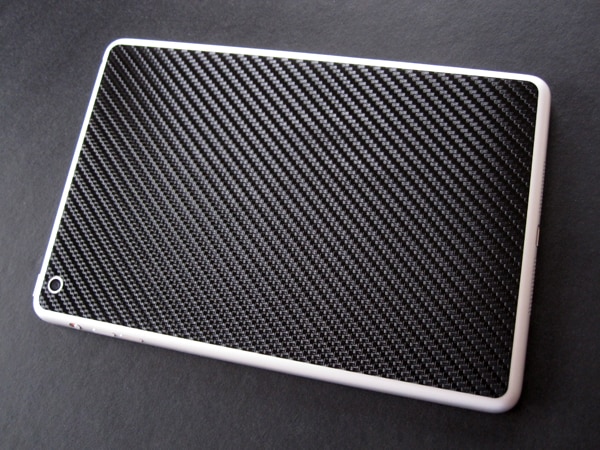 Available in several different colors, in either faux leather or polyurethane with a carbon fiber-style texture, Spigen SGP’s Skin Guard for iPad mini ($20) is otherwise a pretty standard sticker. Instead of covering the entire back of the tablet, it’s a rounded rectangle about 4.9″ wide and 7.4″ tall, with a single opening for the camera.