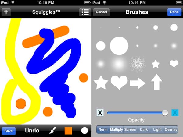 Squiggles offers an impressive list of tool options, including brush, eraser, clone tool, stamp, overlay image, and text buttons, a variety of basic filters, including brightness and contrast adjustments, and a section for layer control. The brushes/overlay/stamp selections are equally robust, with controls given for the opacity and blend mode for each brush. The settings menu allows the user to toggle the ask on shake, smart shape, load cropped, cursor, and smoothing features on and off, along with a slider to adjust the smoothing and a button that lets the user set a finger offset for more accurate drawing.