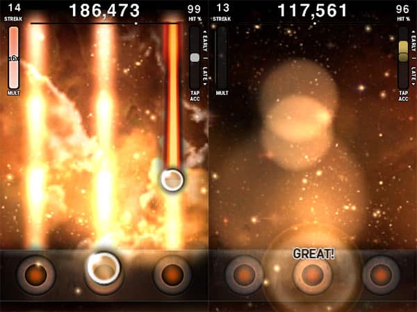 Add to this the occasional random 16x star bonus, and the more challenging four-position challenge stages, and you have a good, working recipe for both fun and building difficulty. Medium, Hard, and Extreme difficulty levels add simultaneous two-taps, arrow shakes, and eventually simultaneous tap-and-holds, two-holds, and three-tap-and-holds. Once again, this isn’t a huge difference from past Tap Tap titles, but the challenge builds more appropriately here by difficulty level. A very simple two-person Bluetooth battle mode is also included, essentially tallying points for two people on the same song, even when the song playback isn’t completely synchronized.