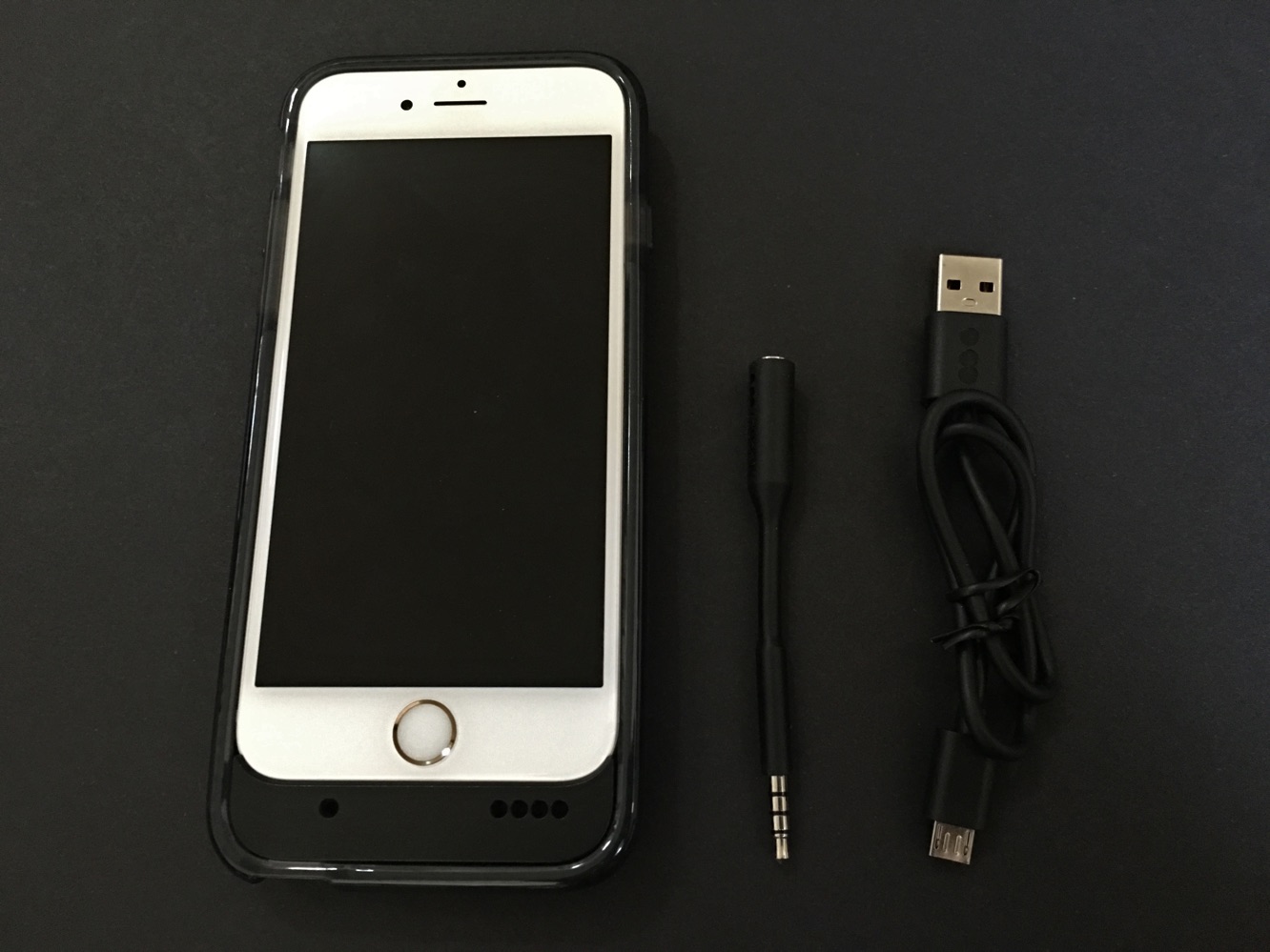 A power button is found on the back of the case, and four nearby LEDs denote remaining battery life. Evo Endurance aims to deliver a 60 percent charge from its 1800mAh battery to a depleted iPhone 6/6s, and the black case comes with a headphone port extender and micro-USB cable.