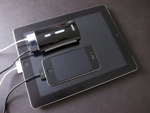 Apart from a mini USB input port in the center of the two full-sized output ports, the former used to recharge TekCharge and the latter to fuel one or two other devices, there’s not much more to the battery. A wall charger, retractable USB wall charging cable, carrying case, and alternate tips for mini-USB and micro-USB connections are included in the package. So is a full-length Dock Connector to USB cable, the tip of which is Apple-sized and thus compatible with virtually every iPad, iPhone, and iPod case on the market.