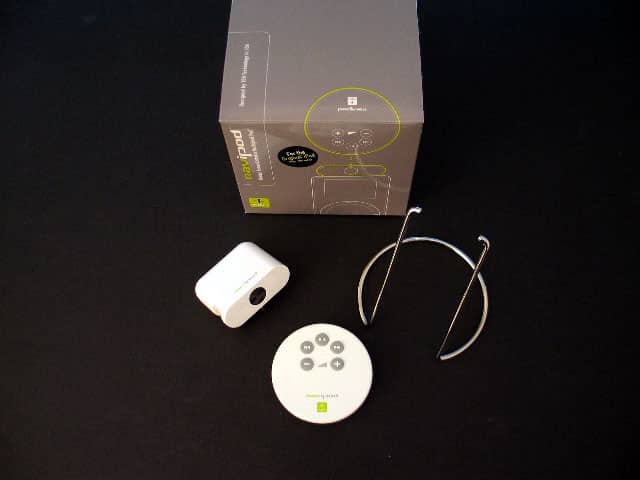 The navipod I received was for the classic iPod (non-docking) and a production unit. There is also a navipod for 3G iPods. It comes in a small square box with a receiver, remote, detachable metal stand and an instruction booklet.