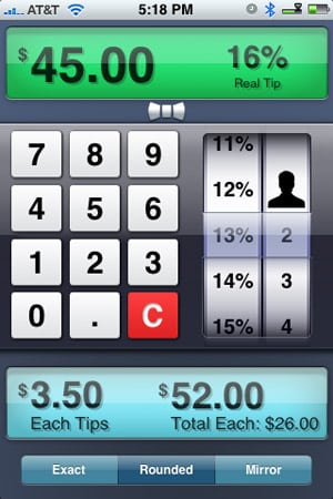 The app’s single screen sports a nice, register-style interface with large green area at the top for the total check amount and a custom numeric pad directly below for entry. Wheel-style pickers for choosing tip percentage and number of people sit alongside the numeric pad, with buttons at the bottom for viewing the exact amount, a rounded amount, or a mirrored, palindrome amount—the latter a form of charge card security that helps you make sure the restaurant isn’t trying to add some unauthorized amount to what you wanted to pay.
