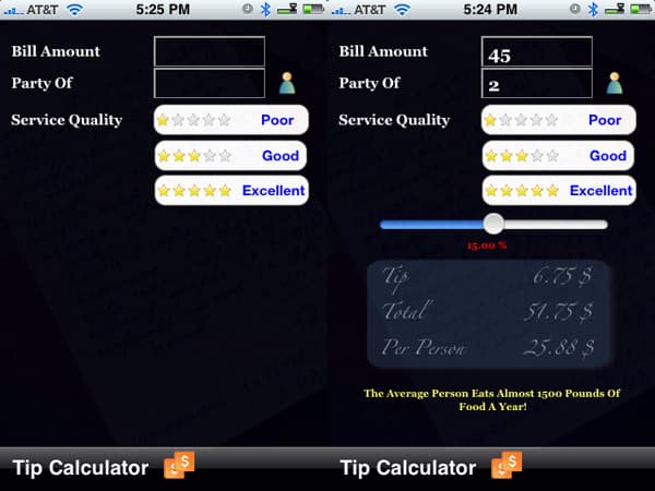 At the bottom, a bit of yellow text displays a bizarre trivia item about food, such as “The average person eats almost 1500 pounds of food a year,” or, “In Japan the favorite topping on Pizza is squid.” No tax calculation or rounding options are available, neither is a field to manually enter a tip percentage. The addition of any of the above features would be a welcome improvement to Tip Calculator, which is the only app we’ve seen to use three totally different typefaces on one screen—that’s not praise.